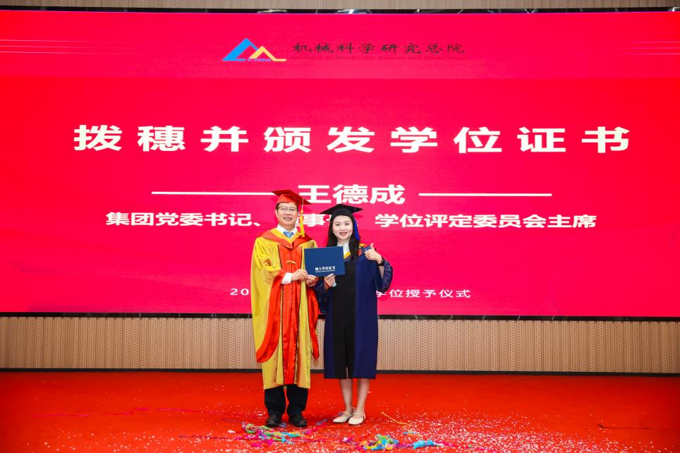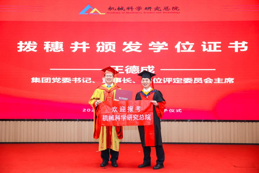 李愛國宣讀了《機械科學研究總院2025屆畢業(yè)生學位授予決定》,王德成為每位畢業(yè)生撥穗正冠并頒發(fā)學位證書。