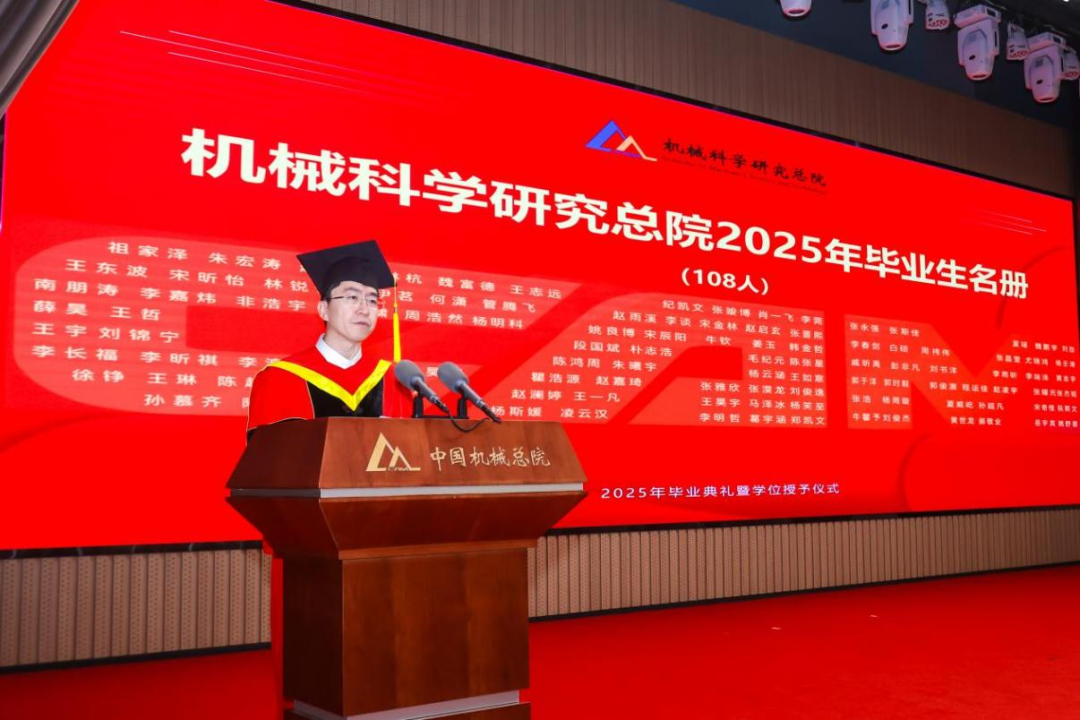 機械總院學位評定委員會主席、集團黨委書記、董事長王德成,集團黨委副書記、總經理孟祥宇,集團黨委副書記、董事李玉鑫,集團黨委委員、副總經理王宇,機械總院學位評定委員會副主席、集團副總經理李愛國,集團副總經理姜超出席典禮,機械總院學位評定委員會委員、京內外各二級單位領導、導師代表、研究生管理部門負責人、2025屆畢業(yè)生及家屬共計190余人齊聚一堂,共同見證這一重要時刻。典禮由機械總院學位評定委員會秘書長、研究生院副院長邊翊主持。
